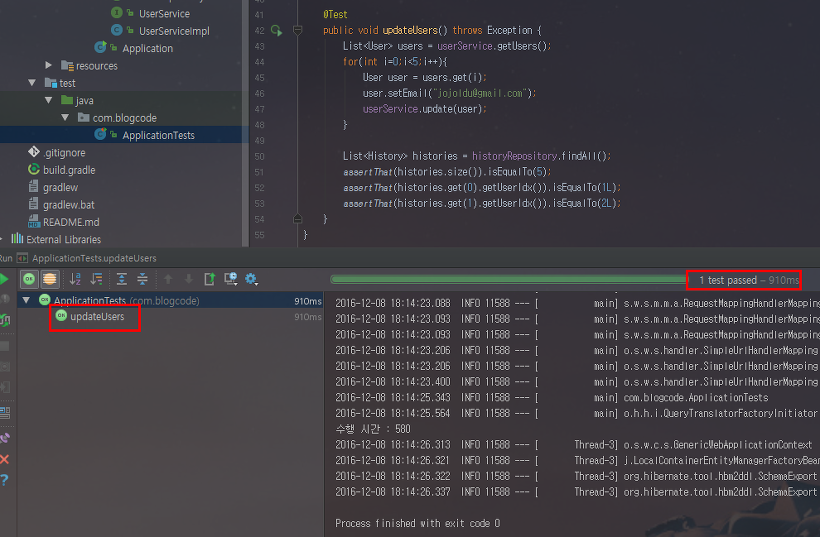 신규 기능은 User의 정보가 수정되면 이를 History에서 저장하여 관리하는 수정내역관리 입니다. userService의 update 메소드가 실행될때마다 History Table에 user의 idx가 저장되도록 코드를 추가하겠습니다.