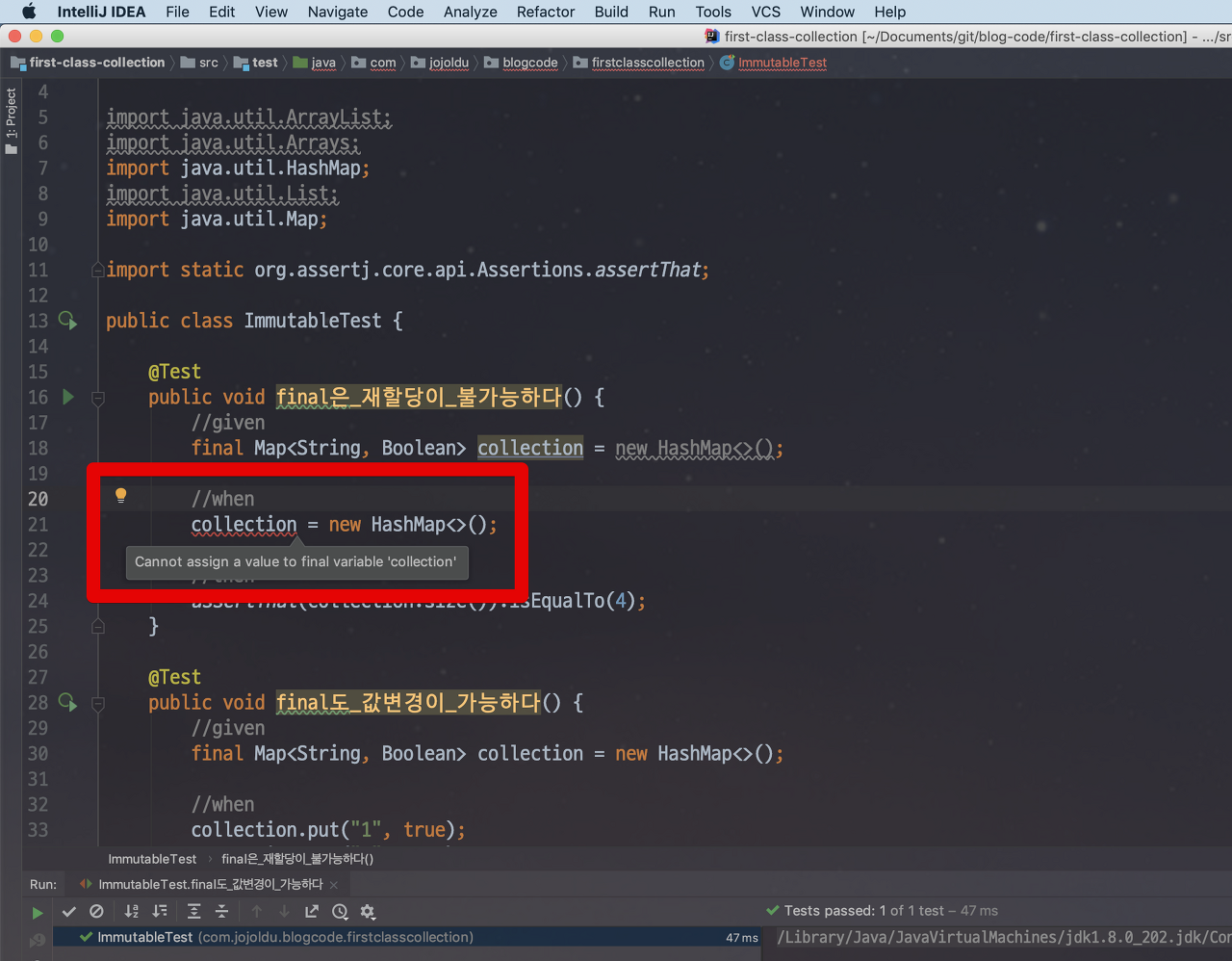* 1. 일급 컬렉션은 컬렉션의 불변을 보장합니다.