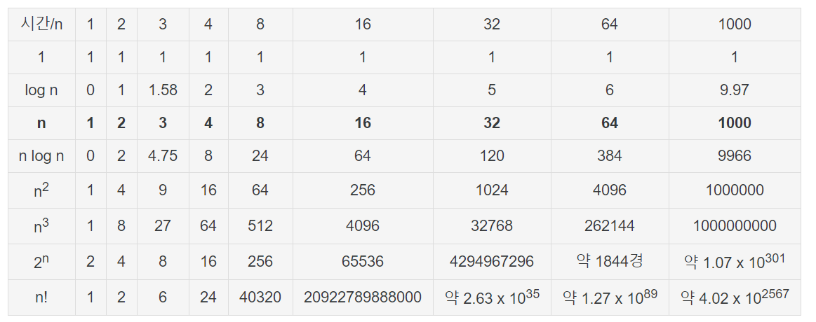위로 갈수록 알고리즘이 매우 빨라지며 아래로 갈수록 nn의 값이 커지고 급격하게 알고리즘의 수행 시간이 증가합니다. 위의 표를 보시면 대충 아시겠지만 대략 컴퓨터가 1억 번의 연산을 하기 위해서는 1초 정도의 시간이 필요합니다. 만약 1만번의 입력데이터가 들어온다면 O(n)의 경우에는 0.1초 O(n²)의 경우 1만 * 1만 = 1억이므로 대략 1초정도의 시간이 필요하겠습니다. 만약 1억 개의 데이터가 들어오는데 실행시간이 1초인 알고리즘 문제를 풀려면 무조건 O(n)이나 O(Log N)의 시간 복잡도로 문제를 풀어야 한다는 이야기겠죠?