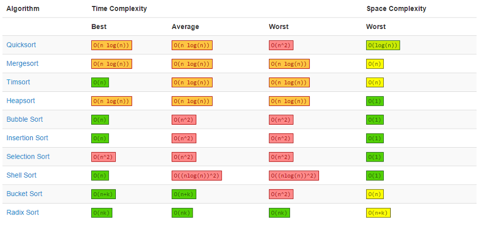 마지막 방법은 알고리즘을 적절하게 이용하는 것입니다. 대표적으로 이진 탐색, 그리디 알고리즘, 정렬 알고리즘 등이 있을 텐데요. 효율적인 알고리즘을 공부해뒀다가 적절할 때 사용한다면 큰 효과를 볼 수 있습니다. 위의 표는 대표적인 배열의 정렬 알고리즘의 시간 복잡도를 나타냅니다.