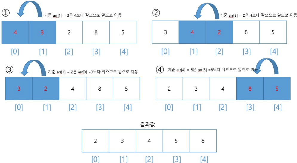 0번째 인덱스는 앞쪽에있는 숫자가 없기 때문에 정렬의 시작은 1번째 인덱스로 시작을 합니다.