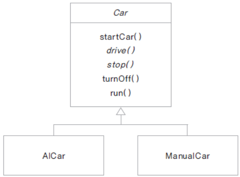 다르게 구현되어야 하는 부분은 추상 메서드로 선언하여 하위 클래스에서 구현 하도록 함