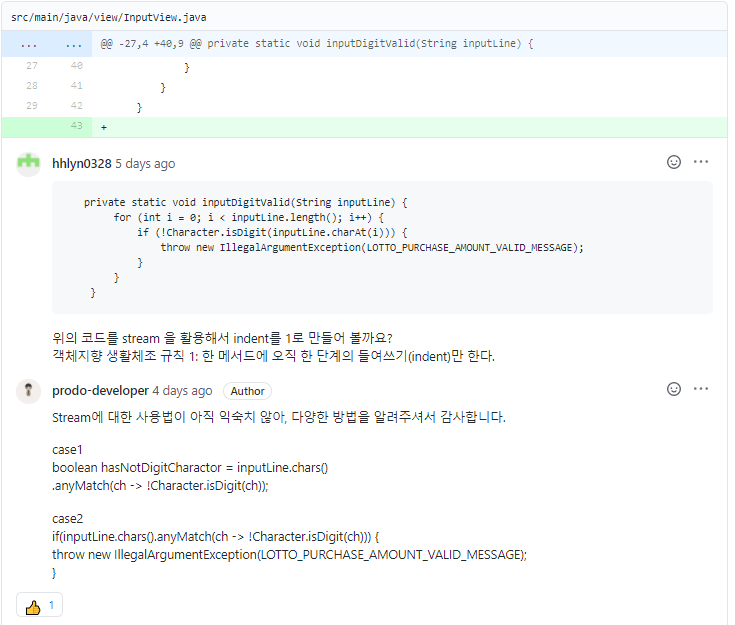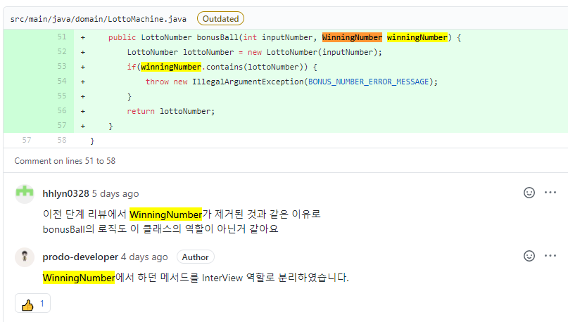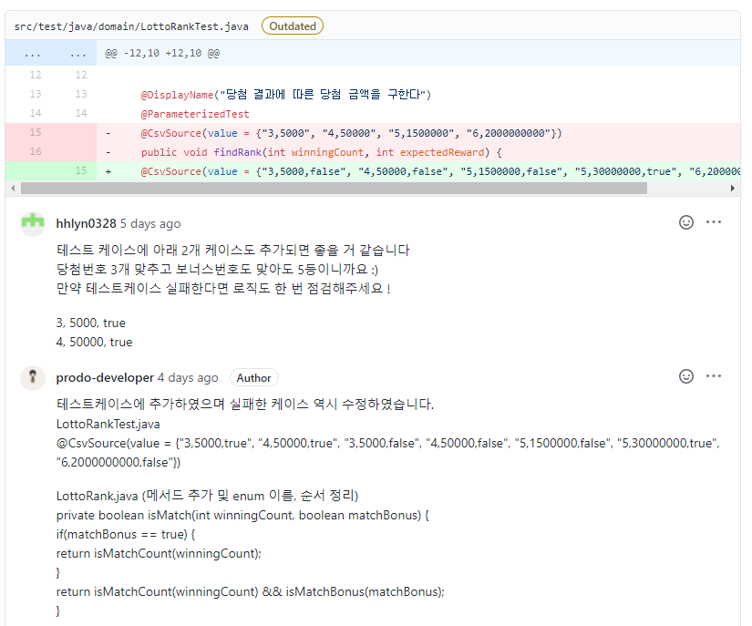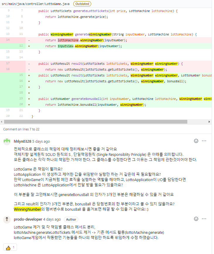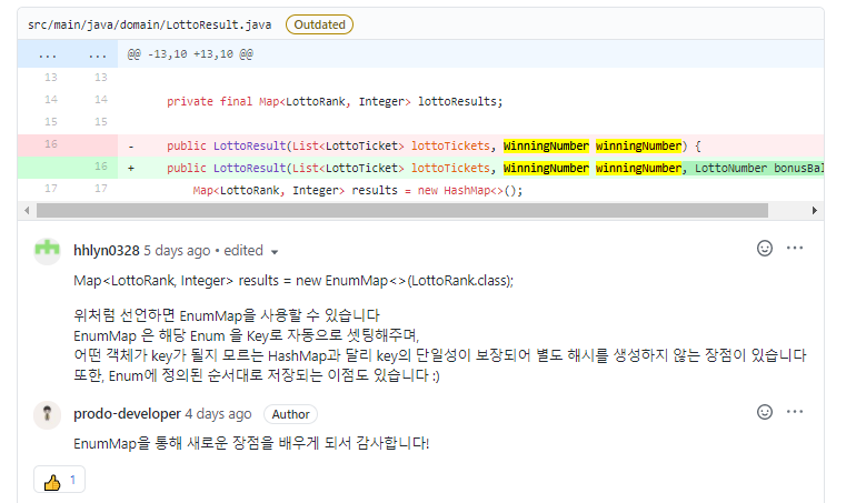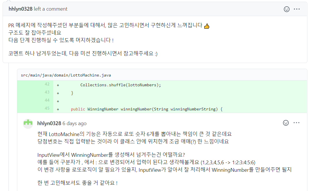 위와 같이 리뷰어님의 친절한 피드백과 빠른 소통으로 이번 로또 미션을 수행하는데 많은 도움이 되었다.