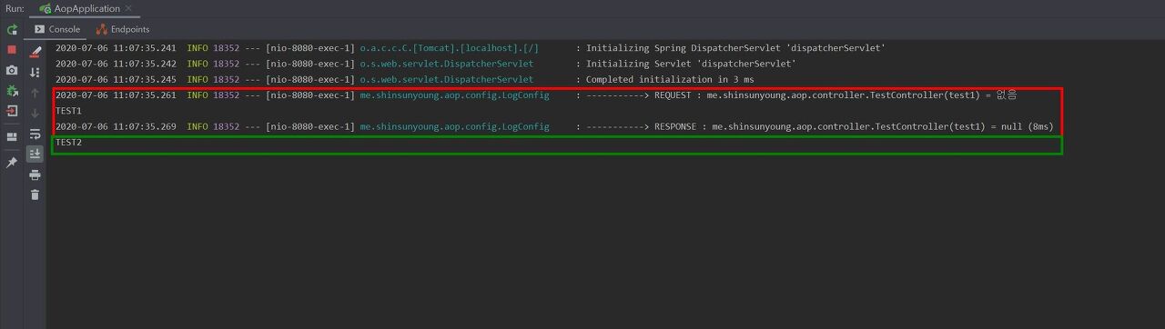 어노테이션을 붙인 메소드는 AOP가 적용되지 않기 때문에 로그가 나오지 않는 것을 확인할 수 있습니다.