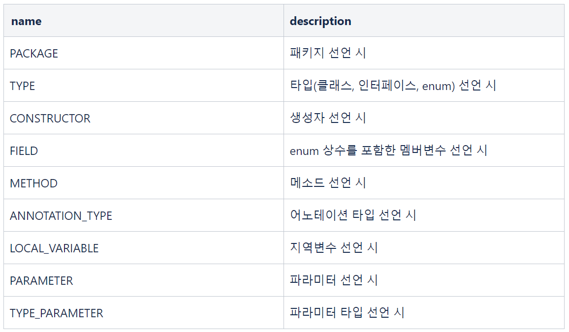 - 어노테이션이 생성될 수 있는 위치를 지정하는 어노테이션입니다.