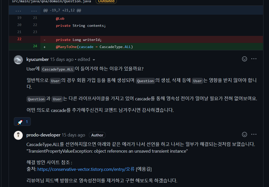 가장 먼저 매핑 관계에 Cascade(영속성 전이)가 일어나면 저장에 실패할 수가 있으므로 주의!
