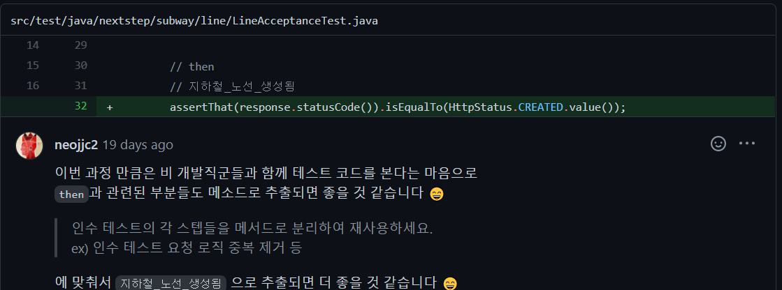 리뷰어님의 친절한 피드백으로 인수 테스트의 각 스텝들을 메서드로 분리를 통해 비 개발직군들도 알아보기쉽게