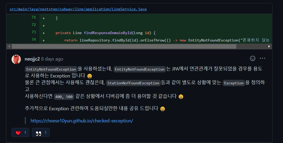EntityNotFoundException을 사용하셨는데, EntityNotFoundException는 JPA에서 연관관계가 잘못되었을 경우를 용도로 사용하는 Exception 입니다 😄