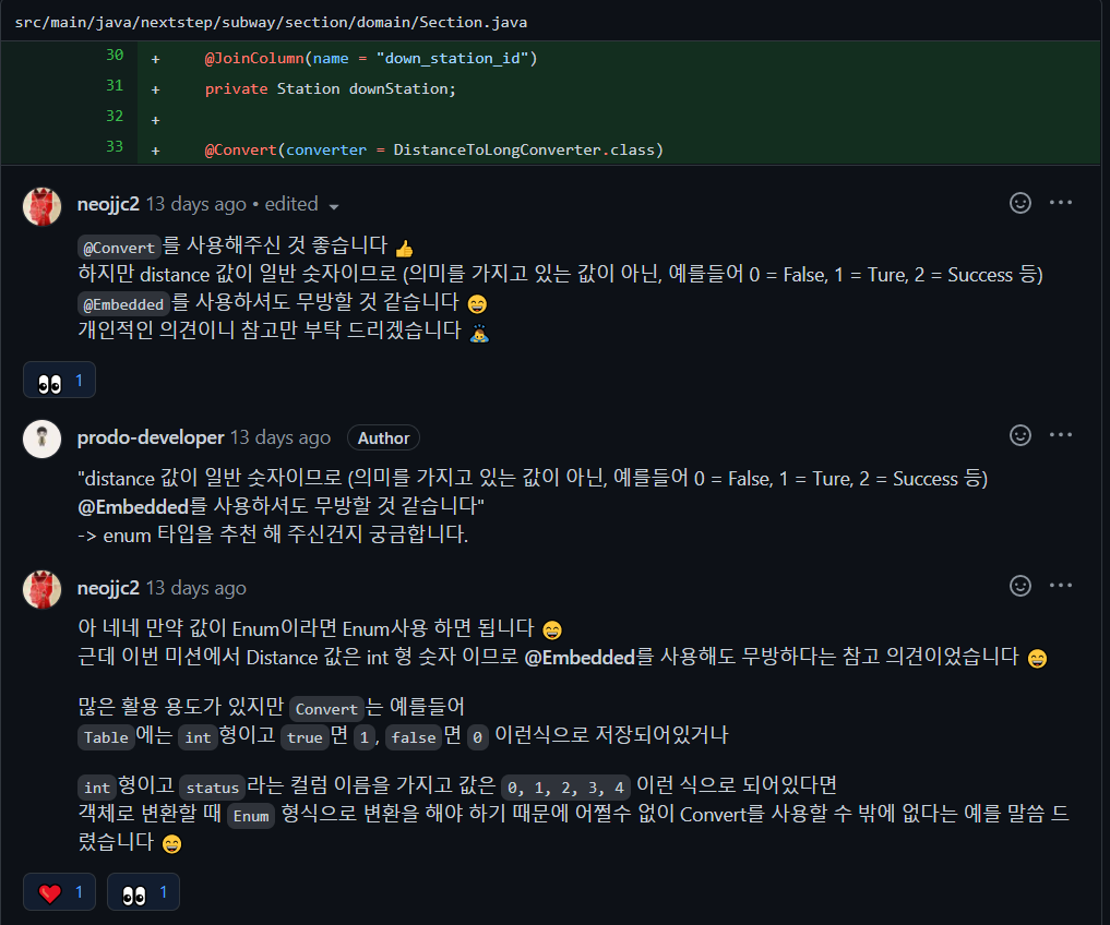인스턴스를 분리하는 과정에있어 숫자로 표현하는것 보다 @Embedded와 enum같은 다양한 방법들도 추천해주셨다.