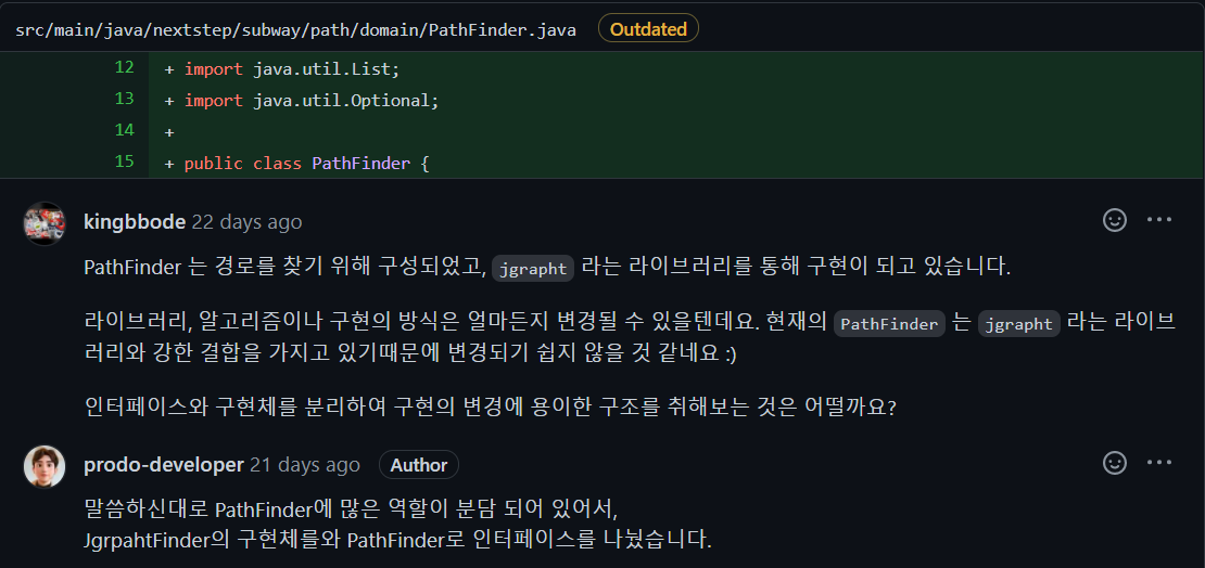 PathFinder와 JgraphtFinder는 강한 결합을 가지고있어, 인터페이스(PathFinder)와 구현체(JgraphtFinder)로 역할별로