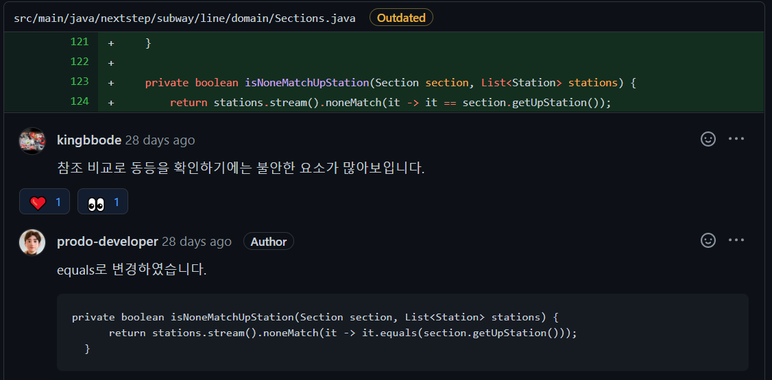 참조 비교로 동등을 확인하기에는 불안한 요소가 많았기 때문에 '=='에서 'equals'로 변경 하였다.