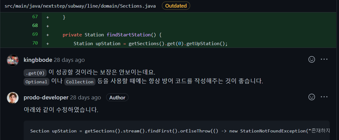 코드스멜(.get(0)) 방지하기 위해 익셉션 처리를 통해 방어 코드를 작성 하였다.