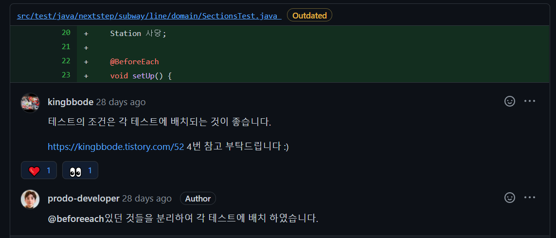테스트를 작성하는 방법을 통해 기존에 @BeforeEach와 전역변수로 선언했던 것들을 테스트의 조건은