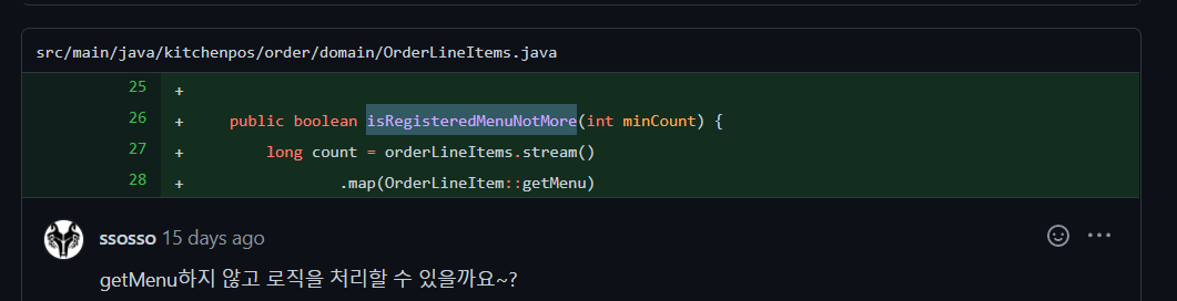 getMenu가 OrderLineItem.java에서 Menu 엔티티를 제거하고 menuId로 전환하면서 getMenuId로해오는 방식으로 전환했다. 따라서 isRegisteredMenuNotMore 관련 메서드를 삭제하였다.