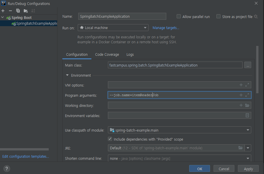 - ItemReaderJob 실행을 위한 매개변수 환경설정