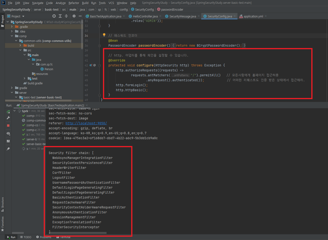 - @EnableWebSecurity(debug = true)설정을 통해 Security와 관련된 디버깅을 켜줍니다.