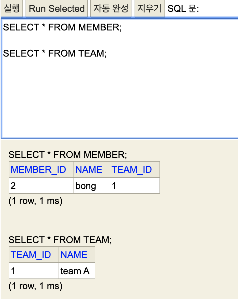객체의 경우 두개의 단방향 관계이기 때문에 한족에서 외래 키를 관리해야한다.