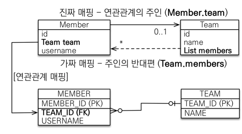 - 연관관계의 주인(Owner) : 객체 양방향 연관관계는 관리 주인이 필요