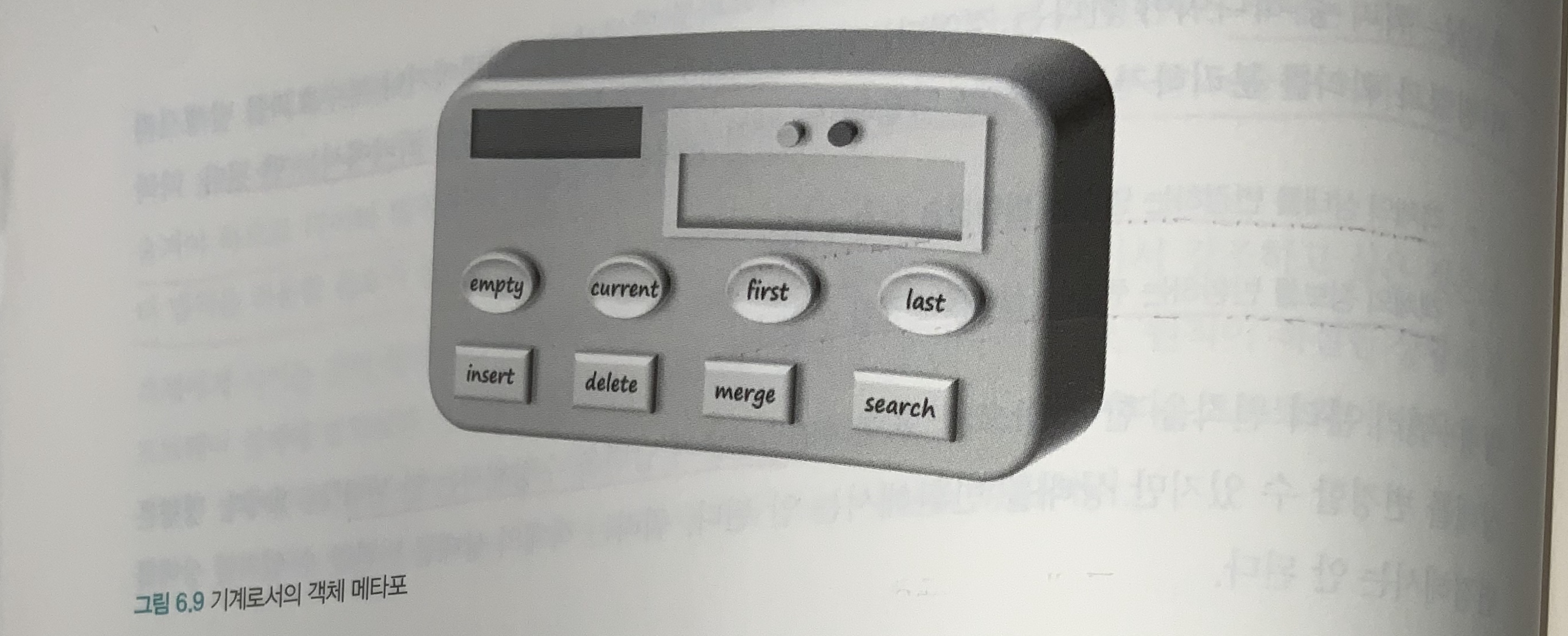 이 관점에서 객체는 블랙박스이며 객체의 인터페이스는 객체의 관찰 가능한 상태를 보기 위한 일련의 디스플레이와 객체의 상태를 변경하기 위해 누를 수 있는 버튼의 집합이다.