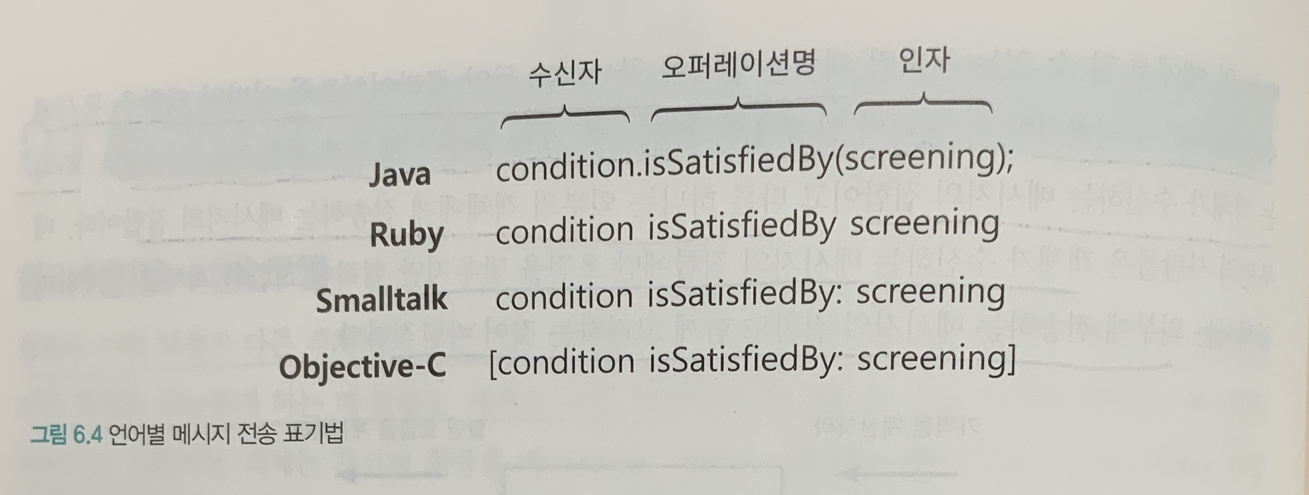- 메세지 전송은 수신자 + 오퍼레이션 + 인자로 구성