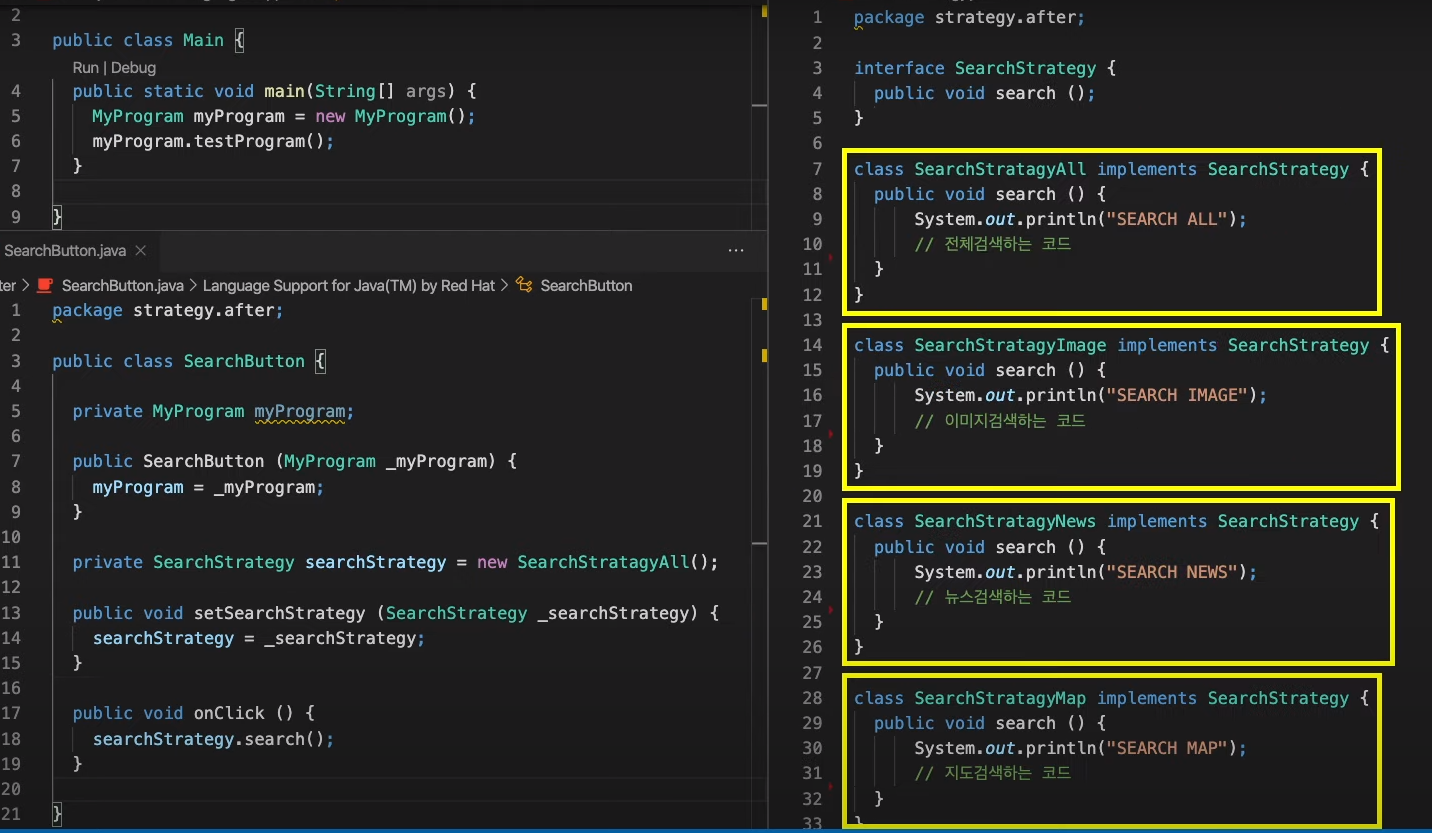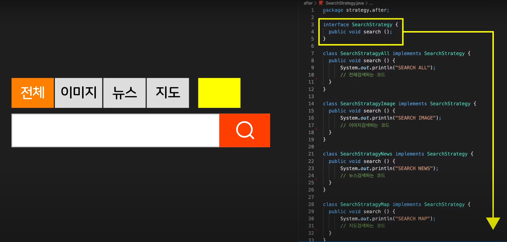 - 전략 패턴은 모드마다 동작 하나하나를 모듈로 따로 분리해서 버튼을 누를때 마다 실행 될 검색버튼 모듈을 갈아끼워주는 방식이다 (전체, 이미지, 뉴스, 지도, 추가할 기능)