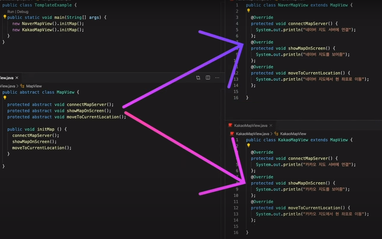 - 다양화된 방식을 각각 자식클래스들에서 오버라이딩하는 방식으로 구현한다.