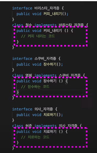 - 인터페이스는 자격증과 같은 개념으로 볼 수있다.