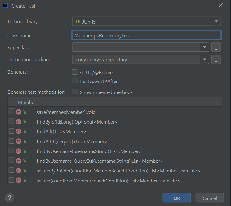 필요한 SuperClass가 있으면 기입하거나, generate하고 싶은 메소드를 체크하여 하단의 OK를 누르면 JUnit이 생성되는 것을 확인할 수 있다.