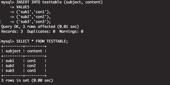 INSERT INTO testtable (subject, content)
