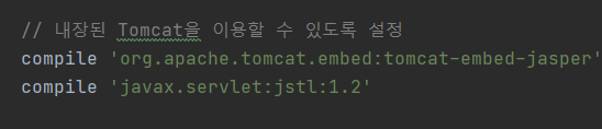 그리고 서비스를 실행하기 위한 build.gradle 파일도 수정하도록 하겠습니다. build.gradle의 dependency안에 아래 2줄을 입력합니다.